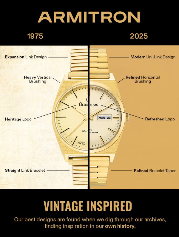 The 1975 watch collection is an invitation to own a piece of Armitron’s storied history. Available in gold-tone initially, the collection will expand with additional colorways later this spring, allowing even more enthusiasts to partake in this milestone celebration.