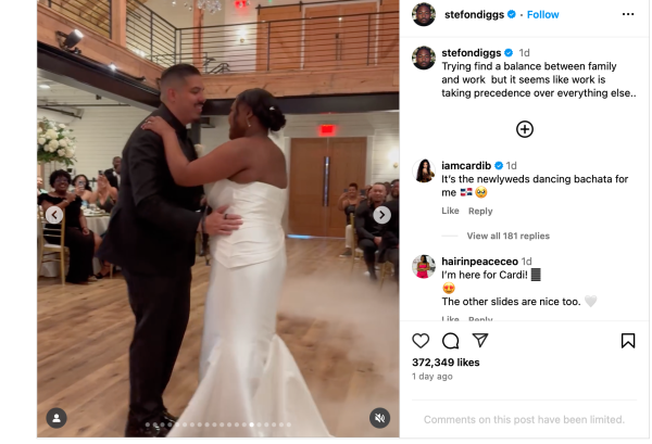 The post included highlights from a wedding celebration and a fun night out with Cardi B. In the caption, Diggs reflected on his busy schedule, writing, “Trying find a balance between family and work but it seems like work is taking precedence over everything else.”